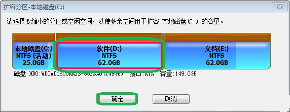 4、在弹出的扩容分区设置窗口中,需选择提供空闲空间的分区。通常推荐使用D盘作为源分区,因其与C盘相邻且易于调整。选择D盘后,软件会自动检测其可用空间。关键注意点在于D盘的文件系统格式必须与C盘一致,即均为NTFS格式,否则无法完成空间转移。此步骤确保数据兼容性,防止分区错误。
