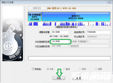 5、接下来进入容量调整界面。在分区前部空间输入框中,输入希望分配给C盘的大小数值,例如输入10GB表示将D盘的10GB空间合并到C盘。输入后仔细核对数据,确认无误后点击开始按钮执行操作。软件会显示进度条,用户需耐心等待处理完成,期间避免强制中断以免数据损坏。操作结束后根据提示重启电脑使更改生效。