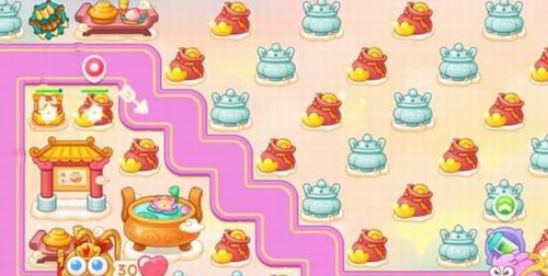 3、荷花清除后立即建造风扇炮塔并升至满级,用于处理上方钱袋目标。酒桌和钱袋障碍清理过程中,保持风扇锁定下方钱袋,同时在障碍空隙处灵活建造多重箭炮塔,以扩大覆盖范围并加速整体进度。